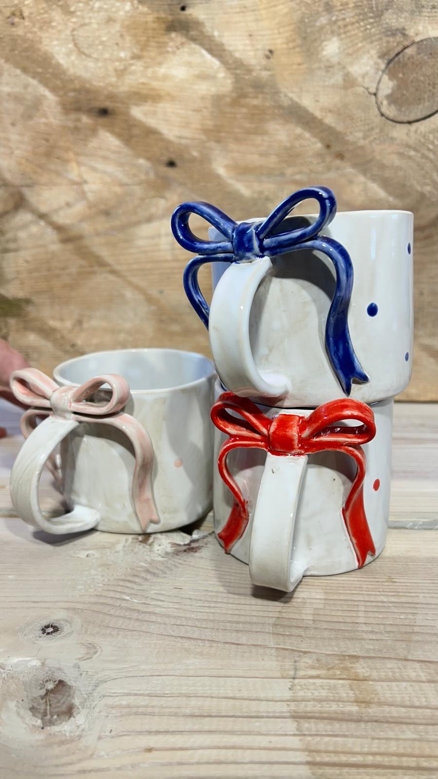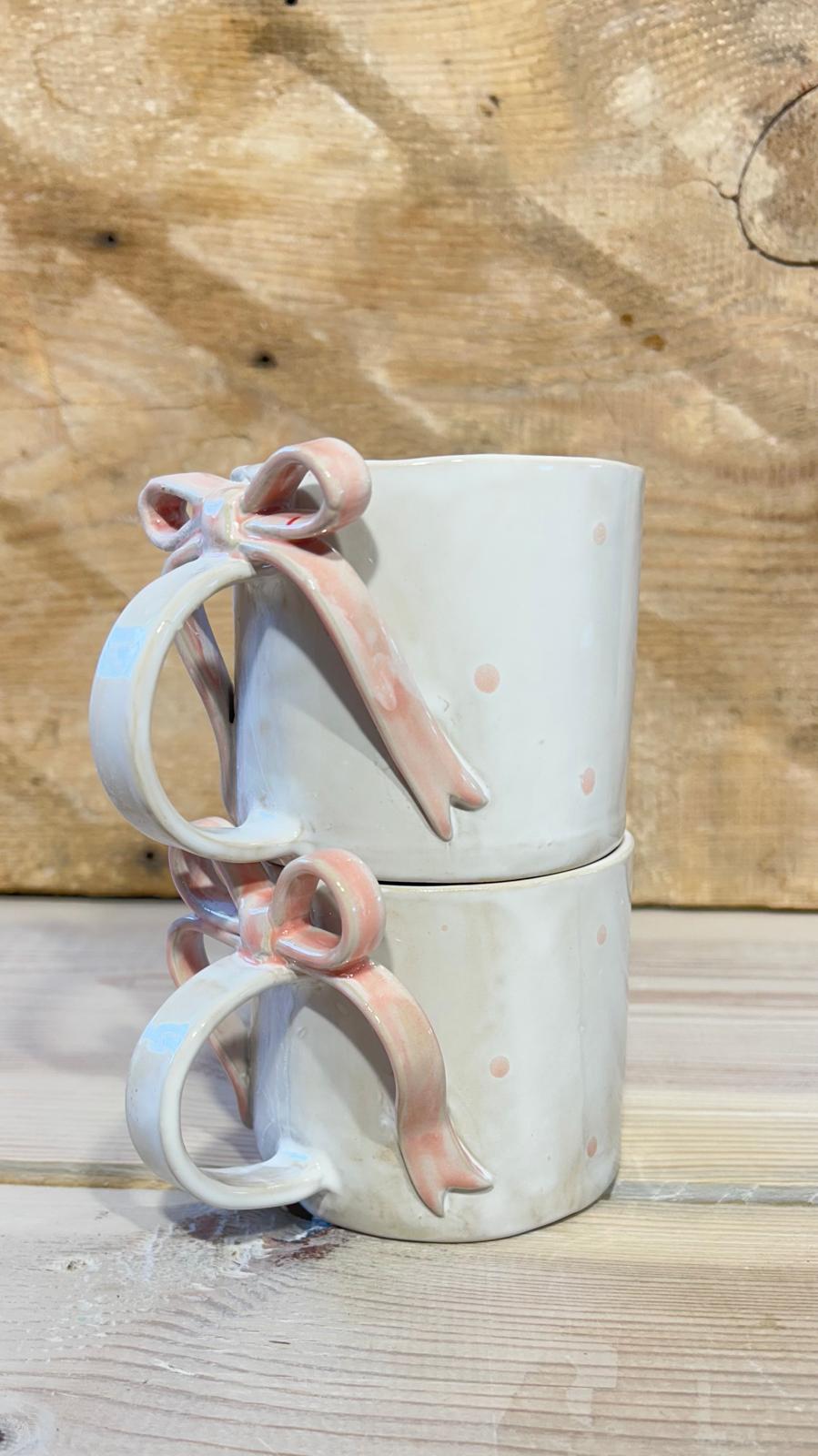 Kubek ceramiczny z kokardką i kropeczkami – ręcznie robiony | 300 ml