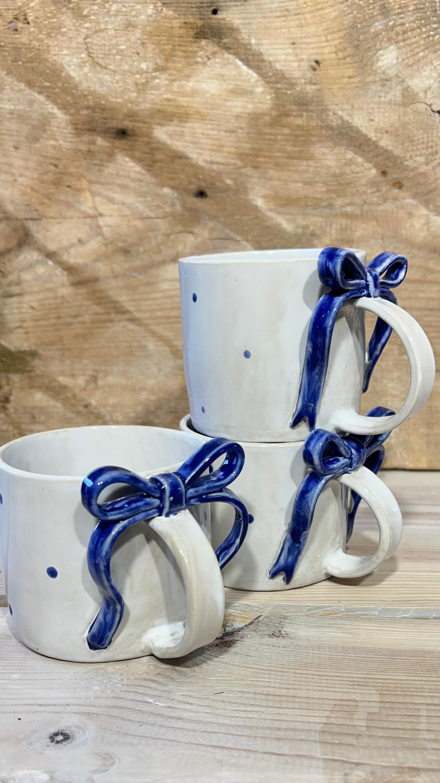 Ręcznie robione kubki z kokardką i delikatnymi kropeczkami. Każdy powstał w moich rękach – od formowania, przez wypał, po szkliwienie. Nie ma dwóch identycznych egzemplarzy, i właśnie na tym polega ich urok.